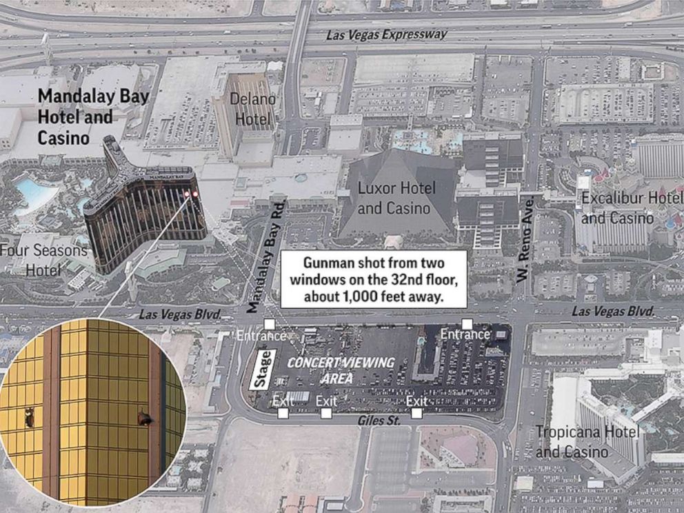 • Location of Mandalay Bay: Clearly marked with details of the shooter’s room.