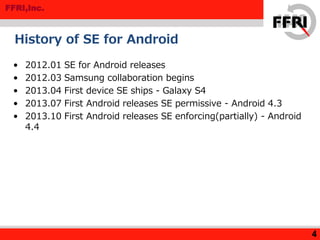 • SE for Android is a security enhancement that provides mandatory access control, improving Android’s security posture.