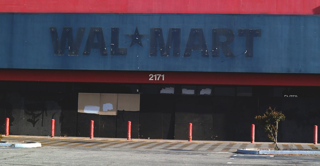 [Image: Exterior of a closed Walmart store with a ‘Store Closing’ banner]