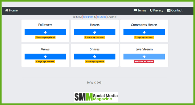 • Zefoy is a third-party website that offers free TikTok likes, followers, and views.